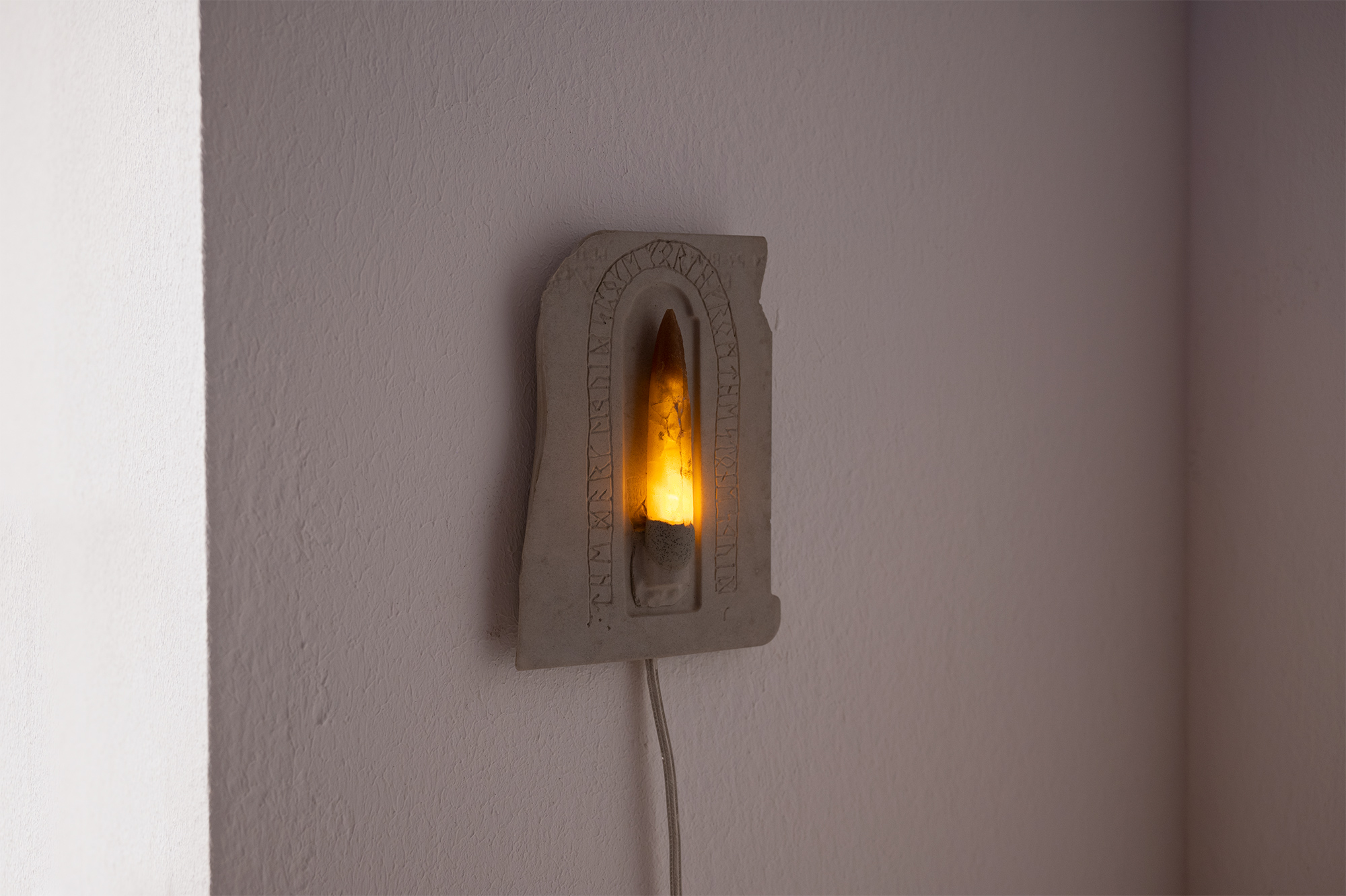 Belemnite fossil (extinct squid-like species), flickering LED, epoxy clay, magnetite sand, concrete