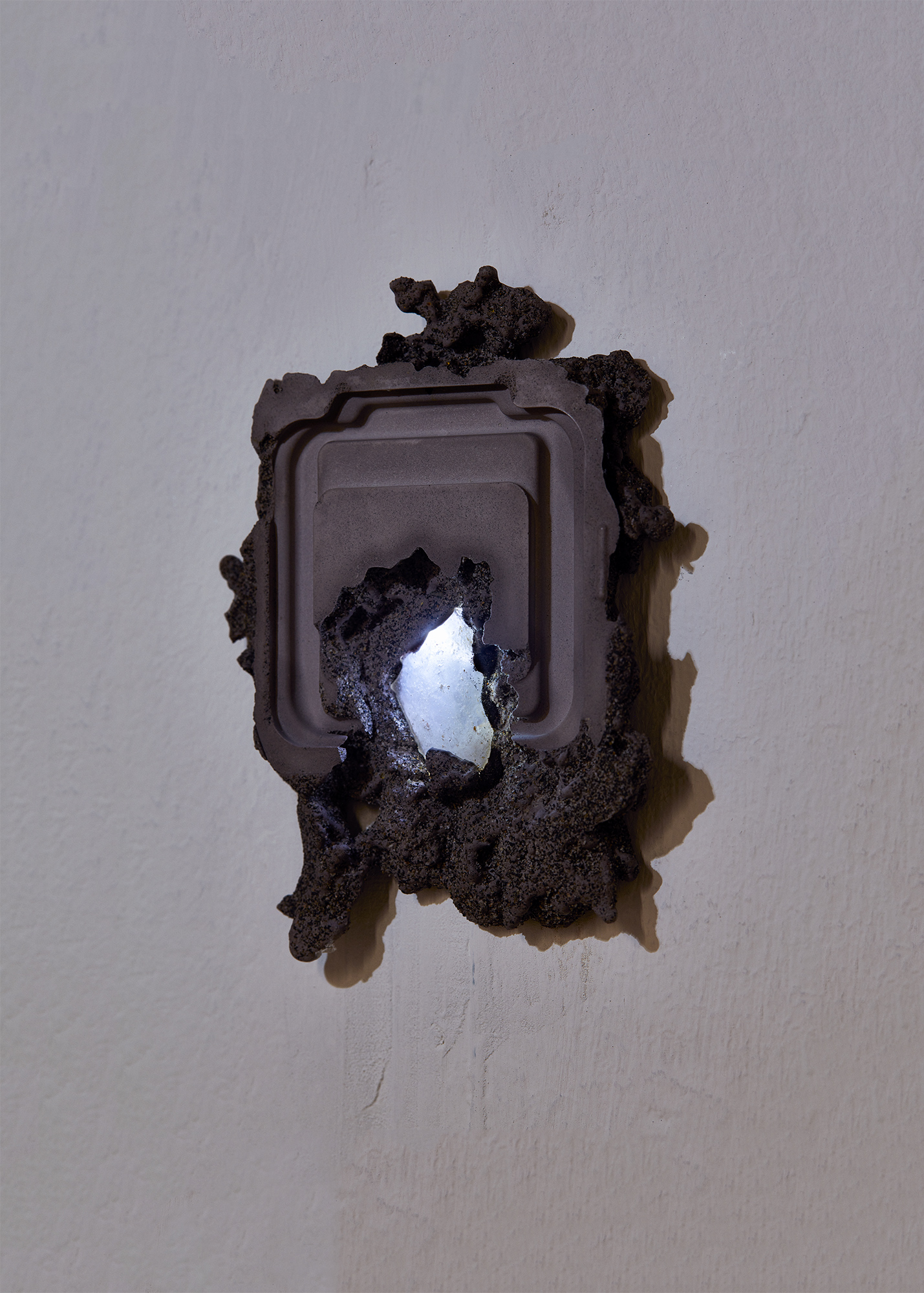 Selenite, flickering LED, magnetite sand, gypsum cement, pigments, graphite, salt, squid ink