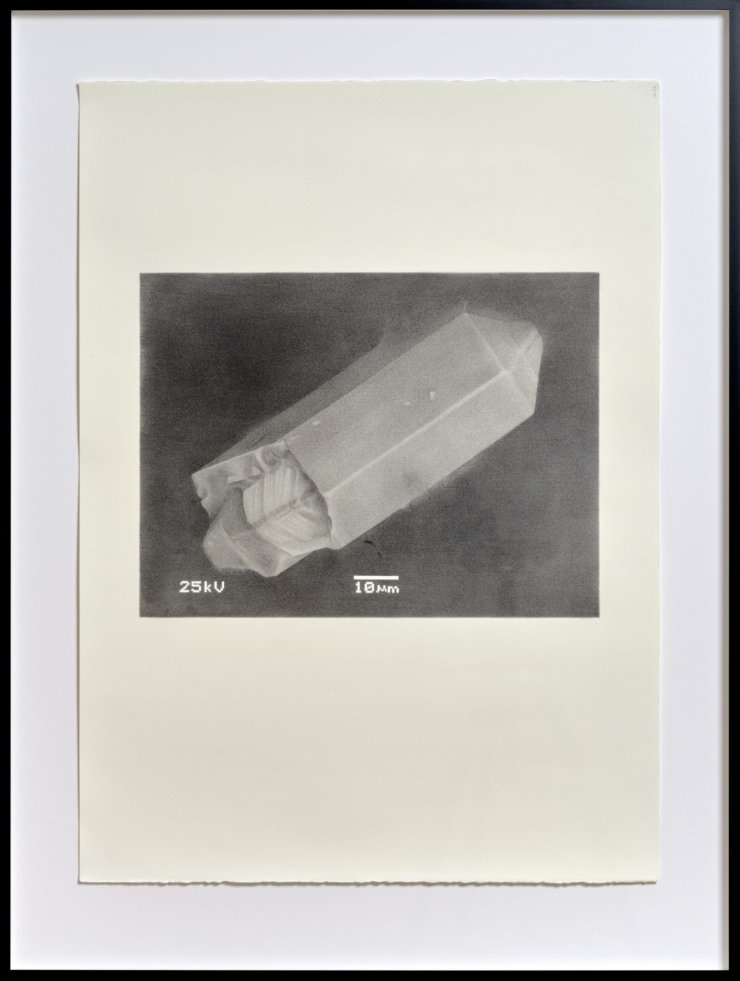 Stones with holes made by clams, graphite and colored pencil on thermo-sensitive polystyrene, plexiglas, LEDs, copper ore
