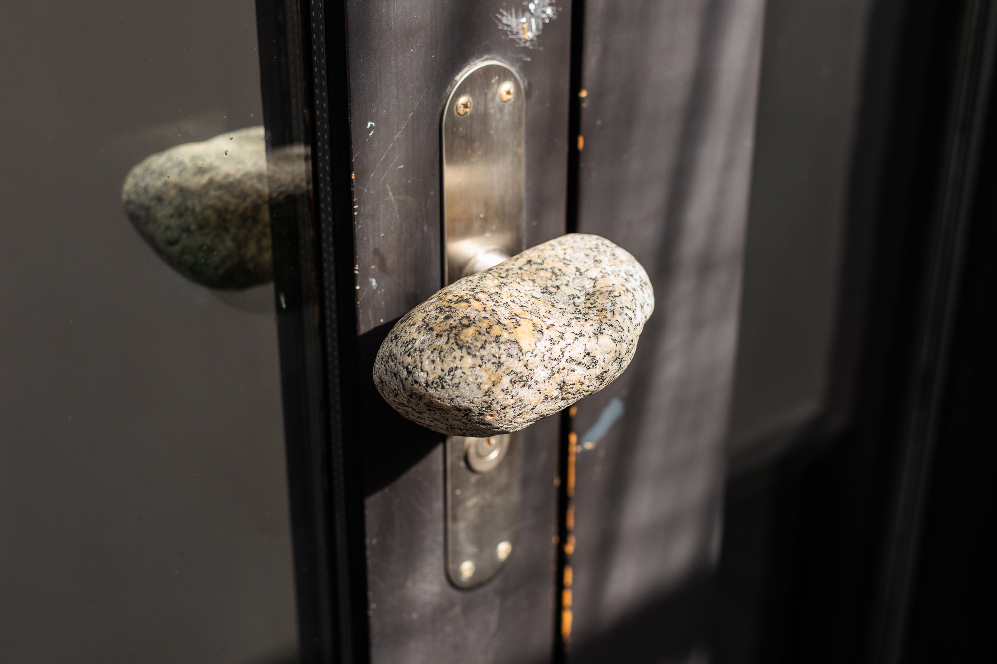 Stones, laser-cut acrylic sheeting, mounting hardware